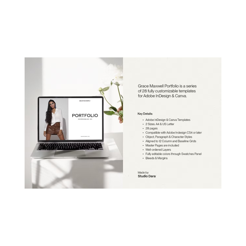 GRACE MAXWELL is a fully customizable portfolio layout created for Adobe InDesign & Canva. The template contains 28 pages and designed in both A4 (297x 210mm) & US letter (8.5"x11"). It's perfect for all designers, photographers, illustrators, architects, stylists, artists, art directors, agencies of all sizes, and more.