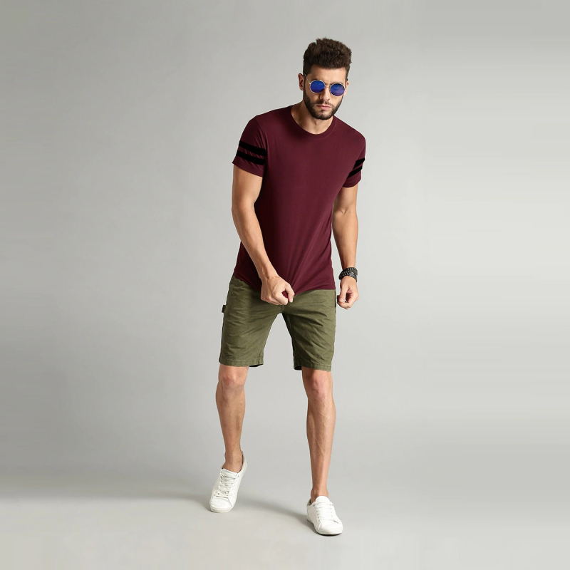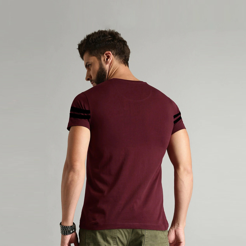 Maroon solid T-shirt, has a round neck, short sleeves.