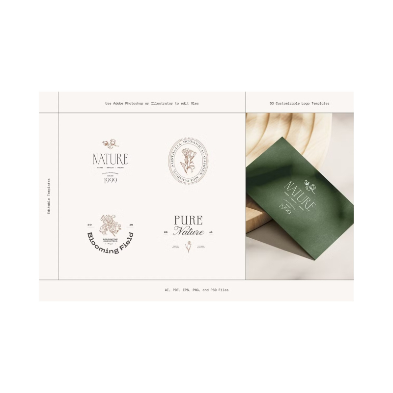 Botanical Kit is a hand drawn collection of 50x pre-made Logo Templates and 140x Floral Illustrations. Use Adobe Photoshop or Adobe Illustrator to create stunning brand identity. Change one of Logo Template or made a new one with compatible hand drawn elements.