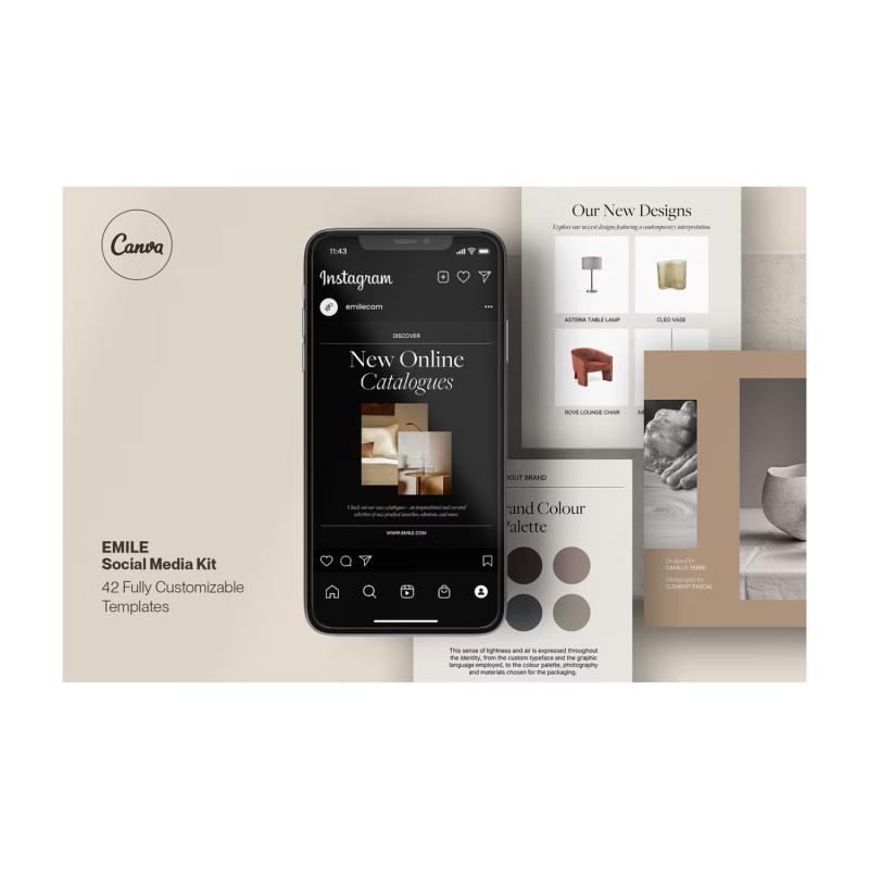 These templates include the original text so you have a guide on what to write and where. The Emile Social Media Kit's color palette is minimalist but confident, without losing sophistication, so you can easily integrate your color palette to match your brand. So everything is fully editable.