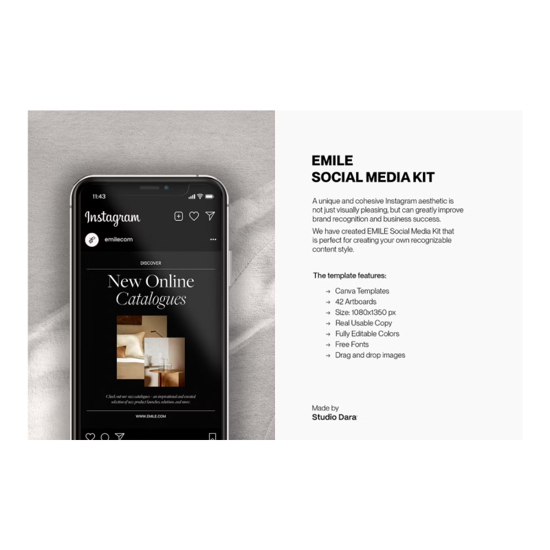 The Emile Social Media Kit by Studio Dara is created in Canva and features a minimalist aesthetic, perfect for architecture & retail brands, influencers, and design studios. The pack includes 42 unique templates in 1500x1500 pixels. Most users browse their Instagram feeds on their phone—and Instagram’s portrait image size is prime for mobile. Portrait posts are optimized for the Instagram algorithm and can be super eye-catching in a feed full of square images. We have created different portrait post styles so that you can share about products, services, news, promotions, trends, quotes, vibrant photos, call-to-action messages, and more to attract the right target audience. Save your time, and money and produce high-quality work.