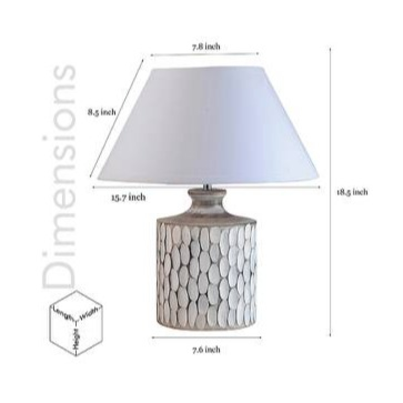 • A traditional design gets a dash of weathered character with this product. Crafted from chunky wood bases, its base showcases a turned silhouette and a distressed, wood finish for an airy and antiqued look. Up above, a w cotton drum shade rounds out the design