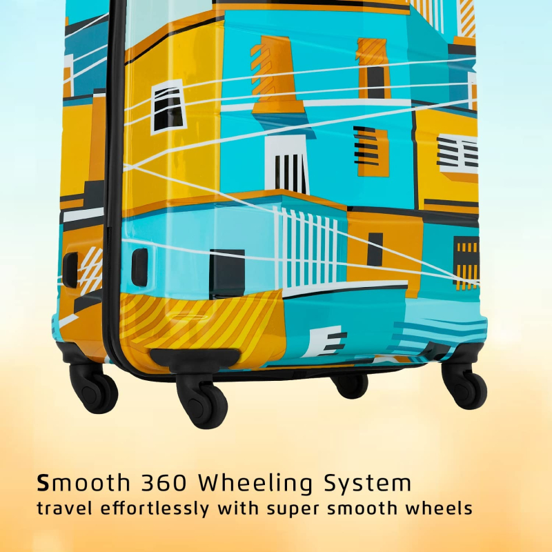 • FEATURES : Number of Wheels - 4, Number Lock, No of Compartments -2, Adjustable Trolley, Hard Case Printed Design Trolley