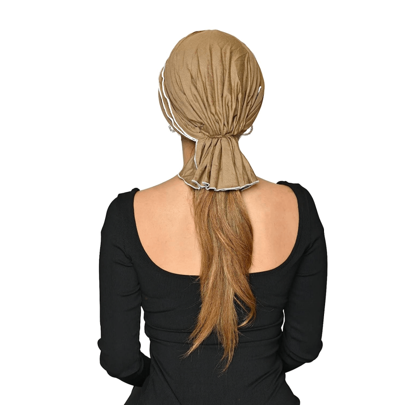 • Material: 95% Bamboo Viscose & 5% Elastane Breathable soft natural Cap. Gathers at front and ruffles at the back.