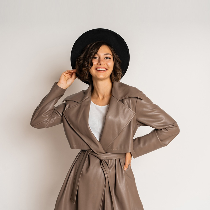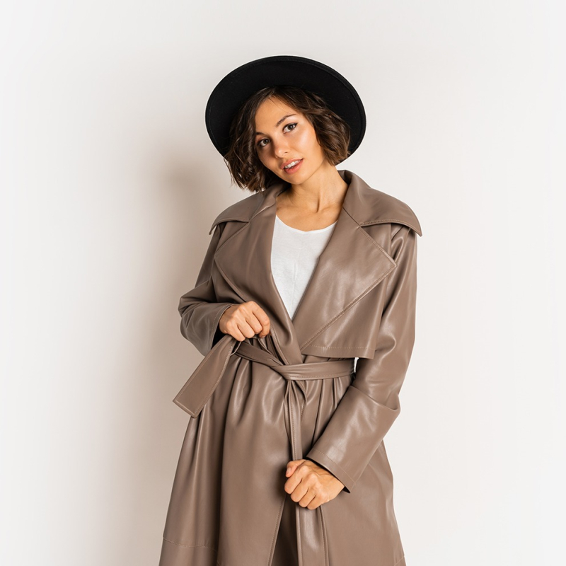 • Brown solid faux leather font-open longline trench coat, has notched lapel collar, long sleeves and single vented hem